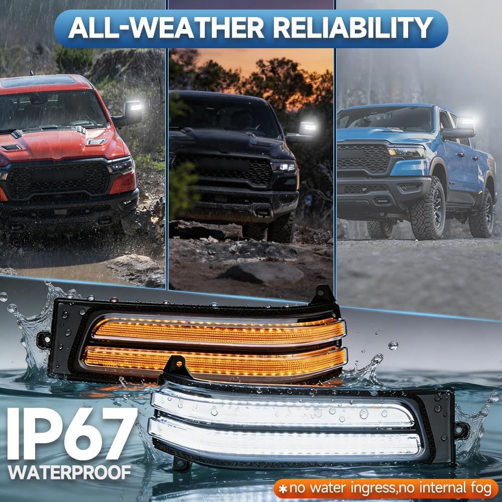 Why Choose Us? ✅ Multi-Function: sequential turn signal + running light + spot light, enhancing ram 1500 mirror lights and ram 2500 side mirror marker lights performance ✅Brightness: 3x brighter than factory lights with long-lasting SMD LED chips, optimized for ram 3500 side mirror led lights ✅ Waterproof Rating: Waterproof IP67—built for all weather conditions, reliable for ram side mirror blinker and ram 1500 side mirror indicators ✅ Installation: Plug-and-play with no modifications for easy ram mirror turn signal setup ✅ Certificate: DOT & SAE certified for street legal use Compatibility: 2025 2026 Ram 1500, 2023 2024 2025 2026 Ram 2500 2023 2024 2025 2026 Ram 3500 68620524AB, 68620525AB, 68620526AB, 68620527AB Package Included 2PCS LED ED mirror turn signals for RAM 1500 2500 3500 Upgrade your RAM’s safety and style today with our high-performance mirror turn signal lights—designed for RAM owners who demand the best in quality, functionality, and convenience. Our lights deliver reliable performance and a perfect fit for your vehicle’s mirror setup.